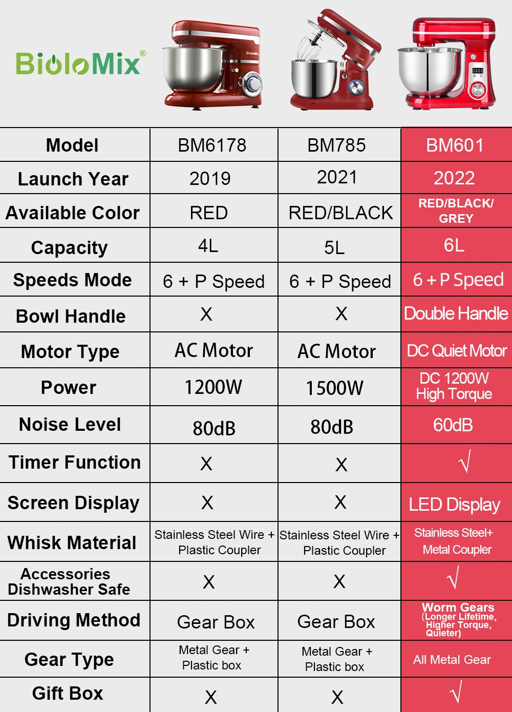 【6L Large Capacity】 BioloMix is equipped with a 6L food-grade stainless steel bowl with dual handles which are more convenient to hold. which can efficiently accommodate family gatherings of 8-10 people. With all metal hardened wire whisk and oversized Teflon coating dough hook, flat beater . Dishwasher safe.