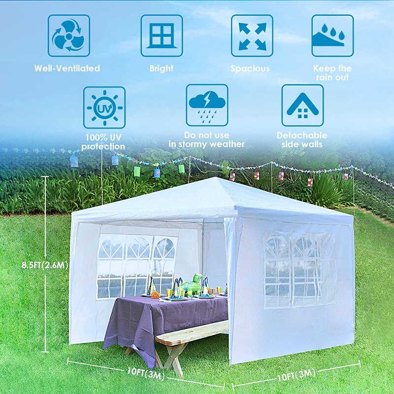 LARGE SPACE: 10x10 feet with 3 sidewalls White Wedding Party Tent provides 100 square feet of shade coverage, 6 to 10 people at the same time for any outdoor events.