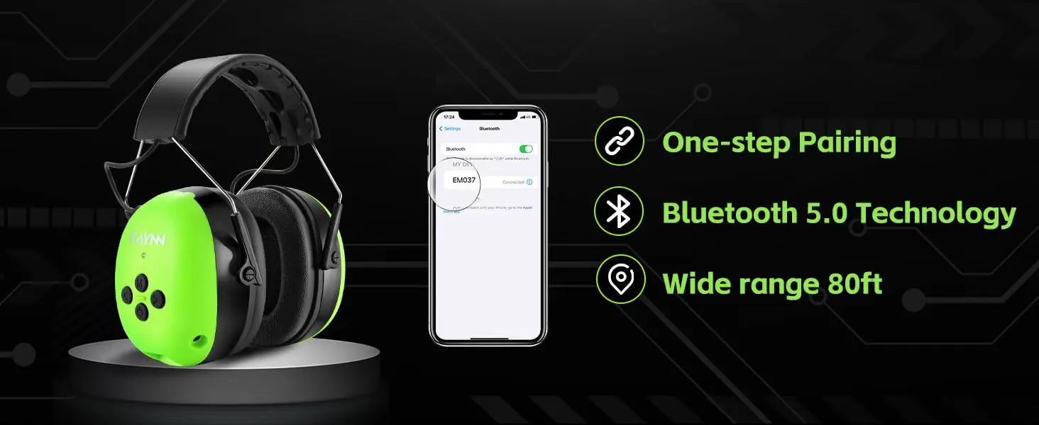 Hearing Protection With Bluetooth 5.0 — The ZOHAN EM037 safety earmuffs is equipped with the latest Bluetooth 5.0 technology that provides a stronger and more stable connection than Bluetooth 4.0 , you can move freely in your work environment and answer phone calls easily , the wireless range is up to 80ft, it also has a HI-FI sound quality that provides you with a smooth music experience.