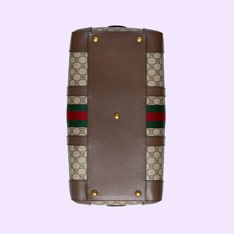 This Gucci Savoy travel bag is crafted from signature beige and ebony GG Supreme canvas. Two archival design elements, double G and webbing, pay tribute to the brand's founder. An adjustable canvas shoulder strap makes it easy to create a shoulder and back shape, making this piece even more versatile.